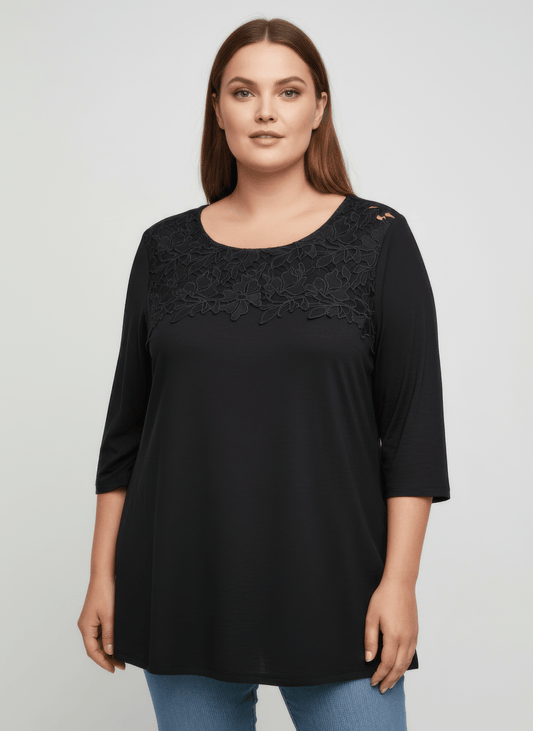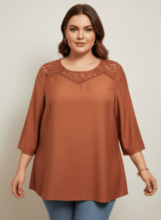 Women Lace Yoke Three-quarter Sleeve Knit Top