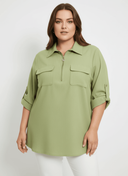 Women Zip Front Utility Pocket Tunic Blouse