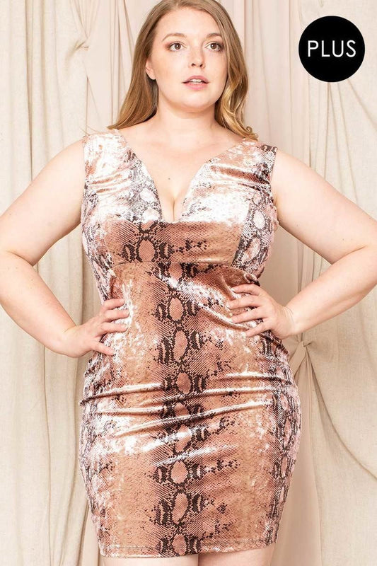 Plus Size Blush Snakeskin Print Sleeveless Deep V Neck Back Zipper Bodycon Mini Dress_
