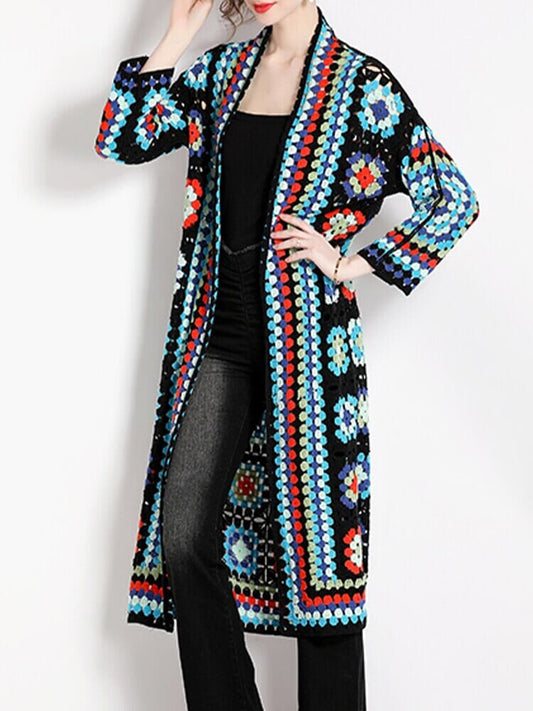 Bohemia Colored Plaid Flower Granny Square Hand Crochet Open Front Long Cardigan_