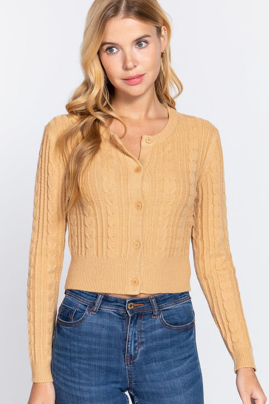 Beige Pink Long Sleeve Cropped Cardigan Crew Neck Solid Button Down Knit Bolero Shrugs_